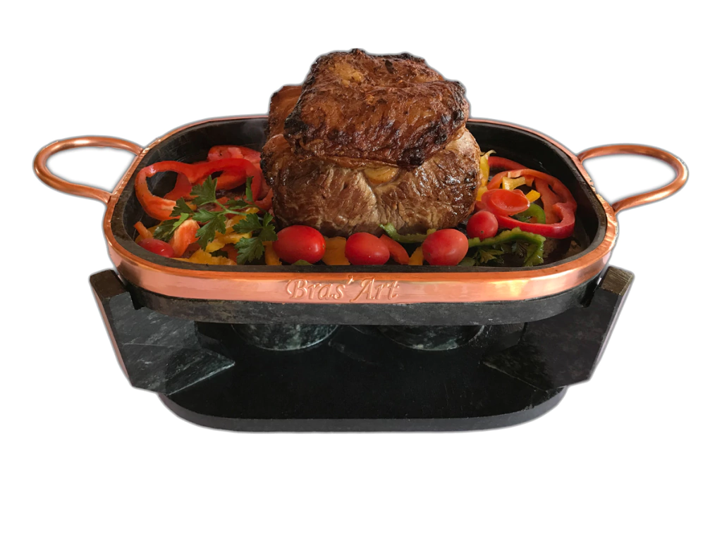 Acompanha: Grelha com Alças e contorno de cobre, metal nobre fixos na grelha, Fogareiro 2 queimadores e 2 tampinhas para apagar a chama ao finalizar