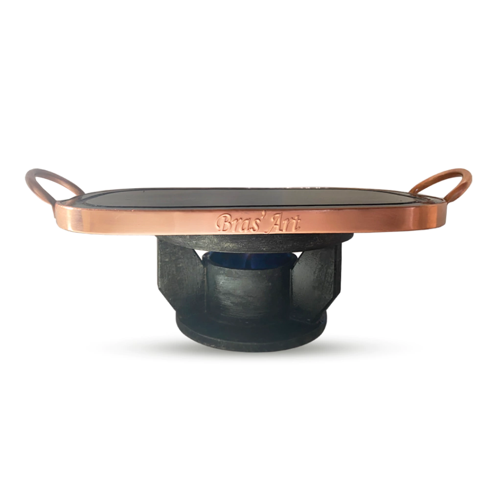 Acompanha: Grelha com Alças de cobre, metal nobre fixos na grelha, Fogareiro 1 queimador e 1 tampinha para apagar a chama ao finalizar