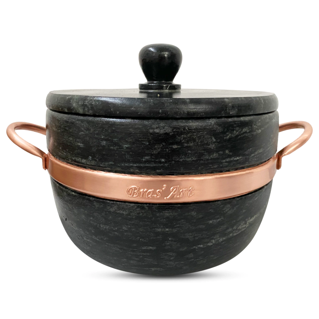 - Acompanha: Tampa de pedra sabão, Alças e contorno de cobre, metal nobre fixos na panela.